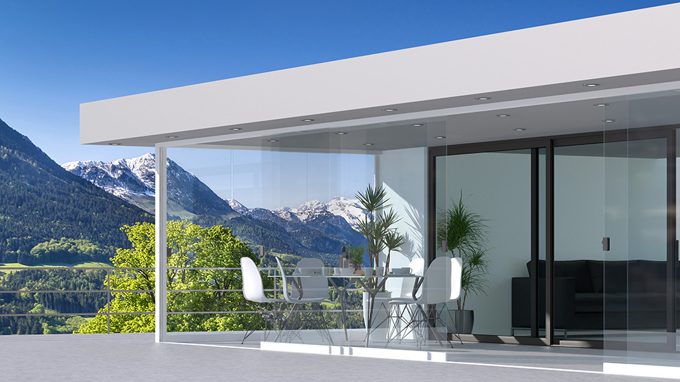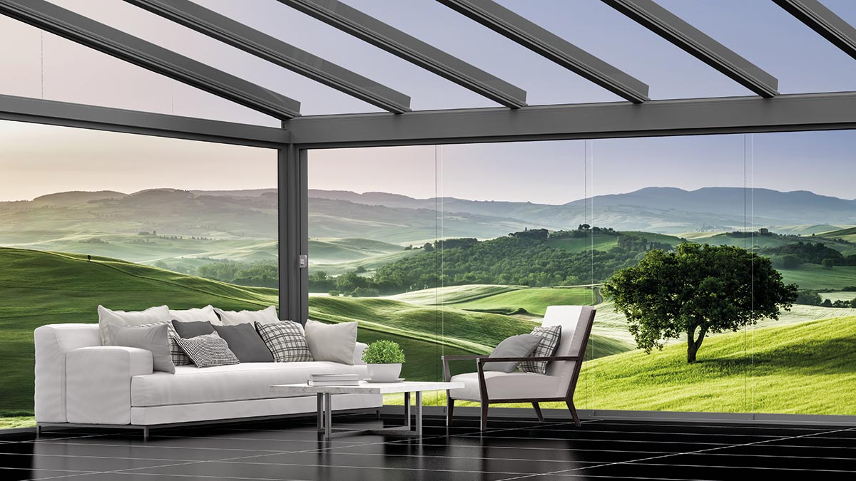 Für Wind- und Wetterschutz sorgen Glaselemente. Die Festverglasungen, Fenster- und Türelemente können in verschiedenen Breiten und Höhen kombiniert werden. Auch GLIDE Schiebeelemente können verkürzt als Fenster eingesetzt werden. Ihr traumhafter Panoramablick bleibt so erhalten. Alle Glaselemente lassen sich selbstverständlich jederzeit ergänzen oder um Vertikalmarkisen nachträglich erweitern.