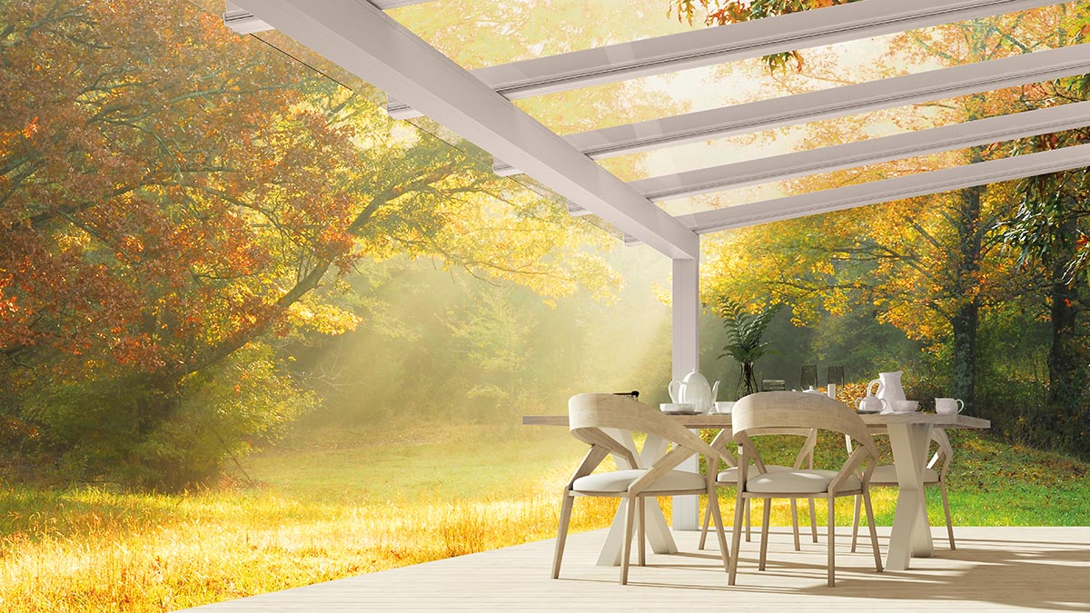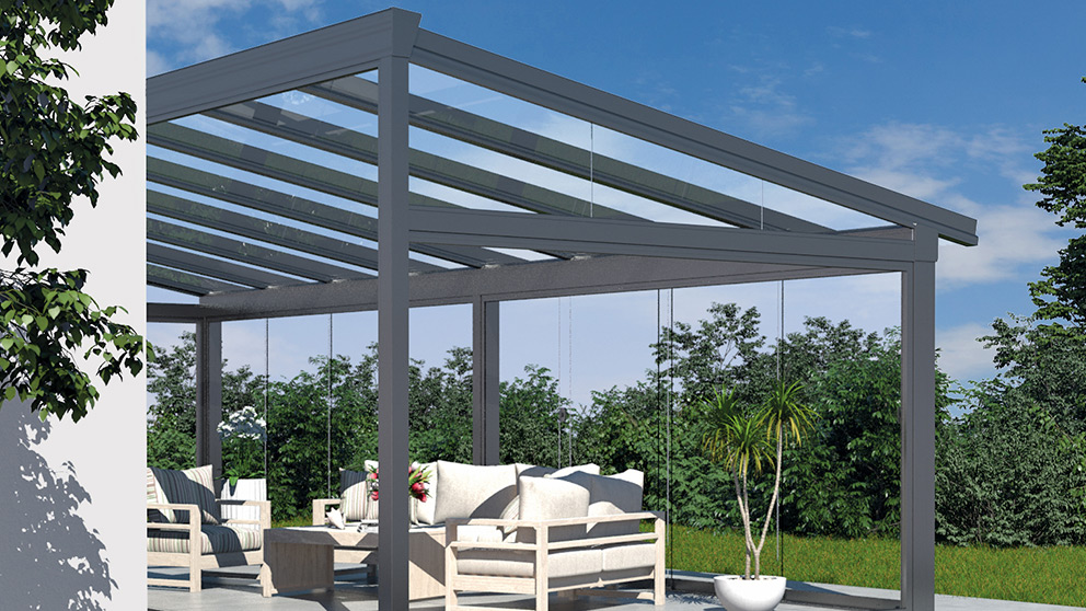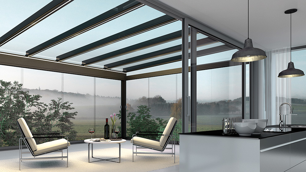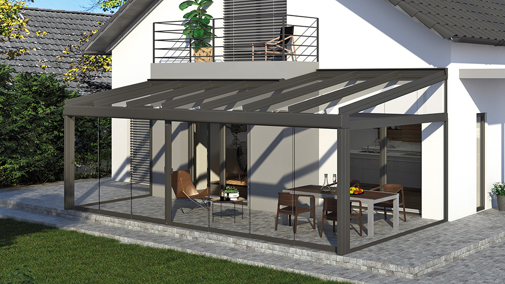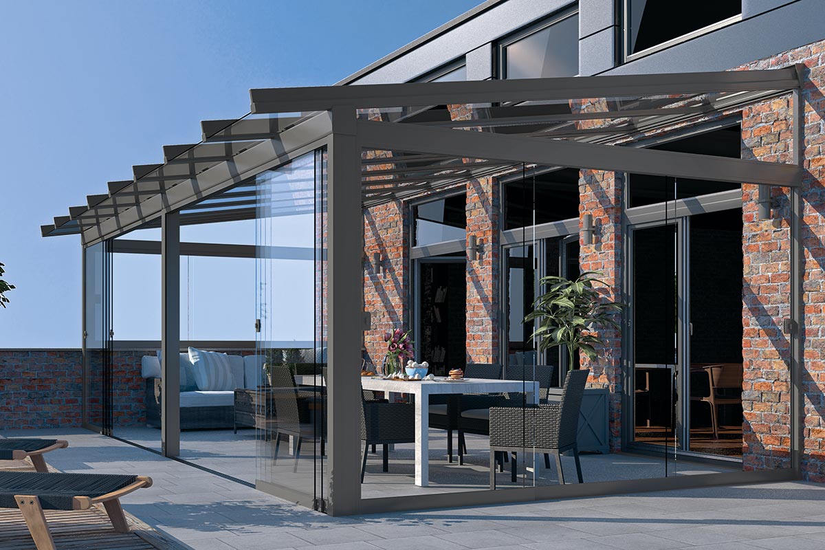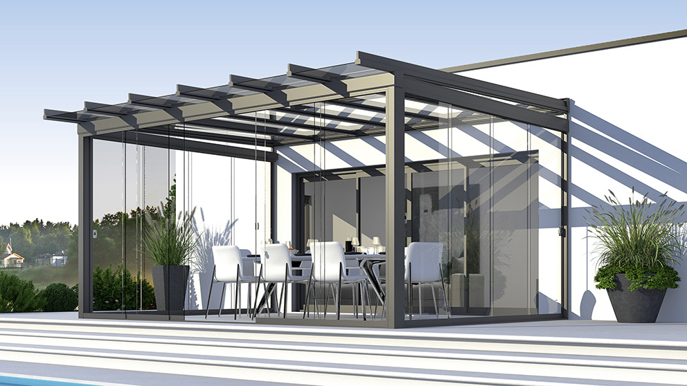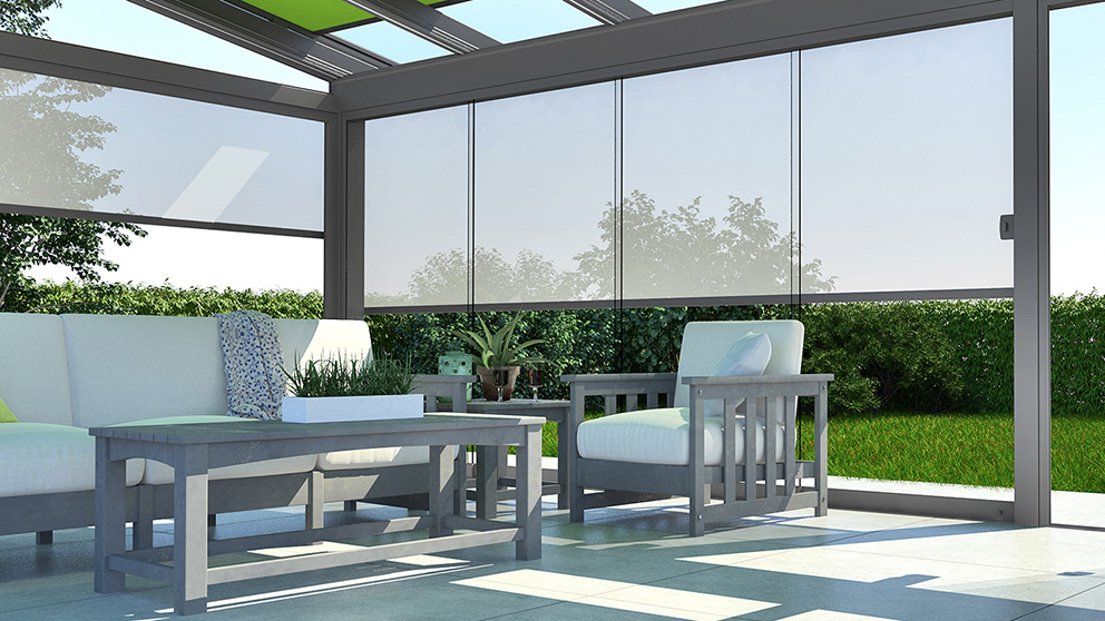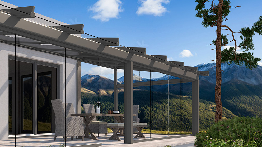 Für Wind- und Wetterschutz sorgen Glaselemente. Die Festverglasungen, Fenster- und Türelemente können in verschiedenen Breiten und Höhen kombiniert werden. Auch GLIDE Schiebeelemente können verkürzt als Fenster eingesetzt werden. Ihr traumhafter Panoramablick bleibt so erhalten. Alle Glaselemente lassen sich selbstverständlich jederzeit ergänzen oder um Vertikalmarkisen nachträglich erweitern.