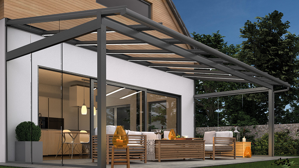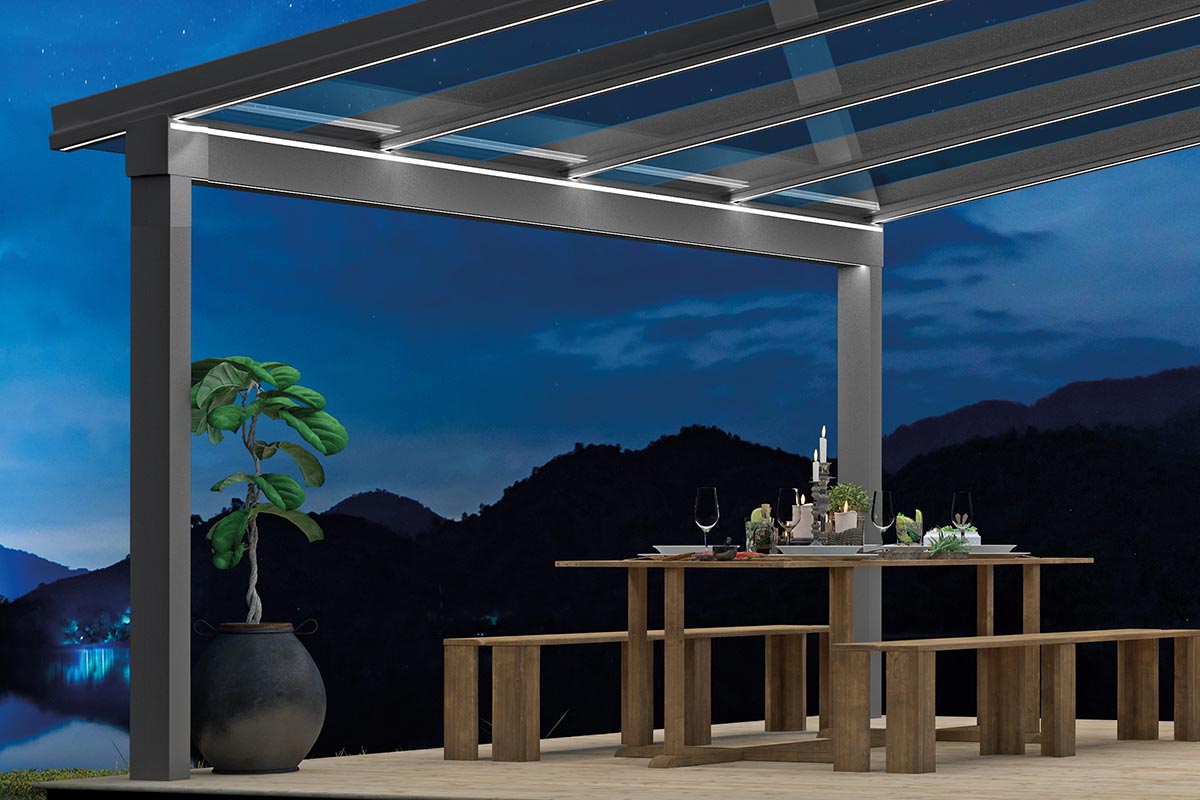 Licht an und die Faszination der nächtlichen Stunden beginnt. Mit unserem LED-Lichtsystem wird Ihre Terrasse oder Ihr Balkon perfekt für Ihre Interessen in Szene gesetzt. Das dimmbare System ermöglicht es Ihnen die Helligkeit frei zu bestimmen. Je nach Terrassendach- Modell können Sie eine klassische Beleuchtung von oben wählen oder zusätzliche LED-Elemente integrieren. Das raffinierte LED-Lichtsystem macht aus Ihrer Terrasse oder Ihrem Balkon eine bezaubernde Insel für abendliche Aktivitäten. Erleben Sie einen atemberaubenden Sternenhimmel und lassen Sie den Tag Revue passieren. Allein – oder in bester Gesellschaft.